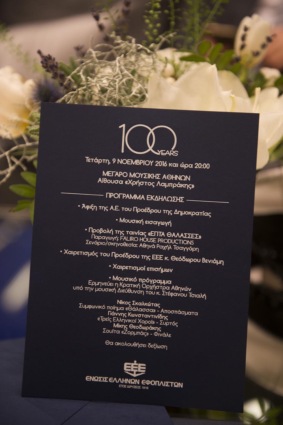 Στις 9 Νοεμβρίου 2016, και ώρα 20.00, η Ένωσις Ελλήνων Εφοπλιστών γιόρτασε στο Μέγαρο Μουσικής Αθηνών, στην αίθουσα «Χρήστος Λαμπράκης» την επέτειο των 100 χρόνων από την ίδρυσή της, παρουσία 1800 προσκεκλημένων. Την εκδήλωση τίμησαν με την παρουσία τους ο Πρόεδρος της Ελληνικής Δημοκρατίας Κύριος Προκόπιος Παυλόπουλος και ο Πρωθυπουργός κύριος Αλέξης Τσίπρας.